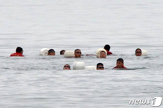(포항=뉴스1) 최창호 기자 = 18일 해병대 1사단 장병들이 경북 포항시 남구 해안에서 전투수영훈련을 실시하고 있다.