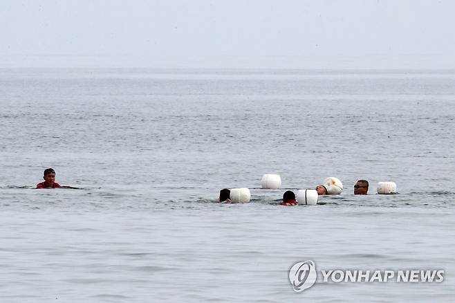 (포항=연합뉴스) 손대성 기자 = 18일 경북 포항시 남구 해안에서 해병대 1사단 장병들이 전투수영훈련을 하고 있다. 2022.8.18