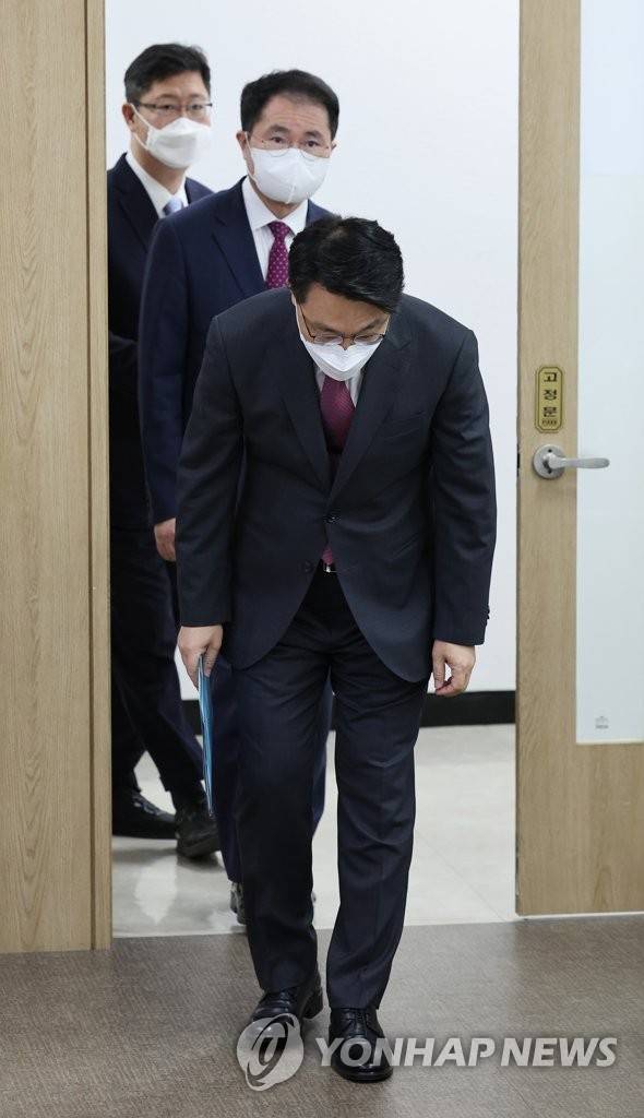 (과천=연합뉴스) 홍해인 기자 = 김진욱 고위공직자범죄수사처장이 18일 정부과천청사 고위공직자범죄수사처(공수처)에서 새로운 슬로건 및 CI를 공개하기 앞서 브리핑 장소에 들어와 인사하고 있다.