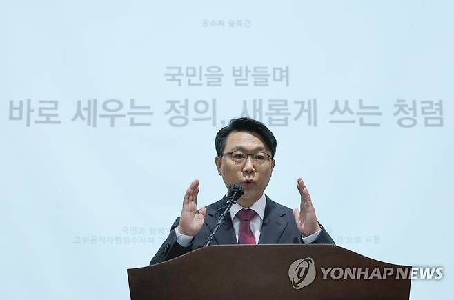 (과천=연합뉴스) 홍해인 기자 = 김진욱 고위공직자범죄수사처장이 18일 정부과천청사 고위공직자범죄수사처(공수처)에서 새로운 슬로건을 공개하고 있다.