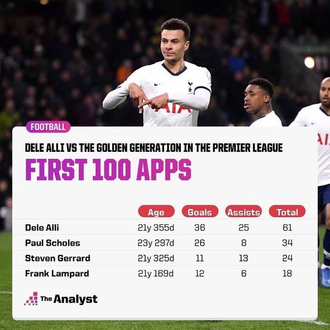 EPL의 전설적인 미드필더 3인방인 폴 스콜스, 스티븐 제라드, 프랑크 램파드와 비교해봐도 알리는 세 명의 선수를 훨씬 뛰어넘었다. EPL 입성 후 첫 100경기에서 알리의 공격 포인트는 스콜스, 제라드, 램파드를 능가했다. 당시 알리는 레알 마드리드마저 노렸던 월드 클래스를 예약했던 선수였다.
