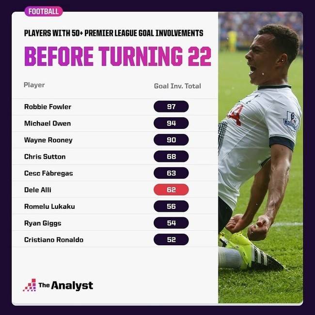 축구 통계 매체 'OPTA'는 17일(한국시간) 22살이 되기 전에 프리미어리그(EPL)에서 맹활약했던 선수들을 재조명하면서 알리의 활약상이 어느 정도였는지를 분석했다.