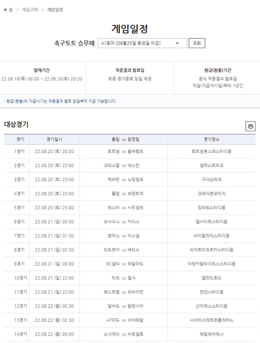 국민체육진흥공단이 발행하는 체육진흥투표권 스포츠토토의 수탁사업자 스포츠토토코리아가 오는 8월 20일(토)부터 22일(월)까지 열리는 잉글랜드 프리미어리그(EPL) 8경기 및 스페인 프리메라리가(이하 라리가) 6경기 등 총 14경기를 대상으로 하는 축구토토 승무패 41회차 게임을 발매한다고 밝혔다.