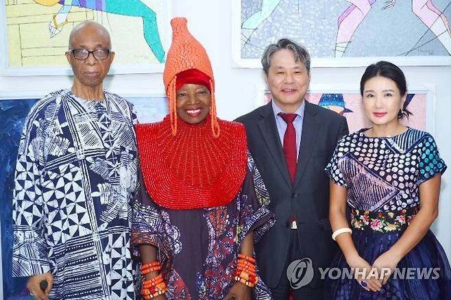 (서울=연합뉴스) 주나이지리아대사관이 지난 10일 나이지리아의 저명한 예술가이자 라고스 소재 니케 아트 갤러리 관장인 니케 오쿤다예(Nike Okundaye)를 나이지리아 내 2030 부산세계박람회 홍보대사로 위촉했다고 18일 밝혔다. 사진은 홍보대사 위촉식에서 기념 촬영하는 김영채 주나이지리아 대사(오른쪽 두 번째)와 니케 오쿤다예 관장(왼쪽 두 번째). 2022.8.18 [문화체육관광부 제공. 재판매 및 DB 금지]