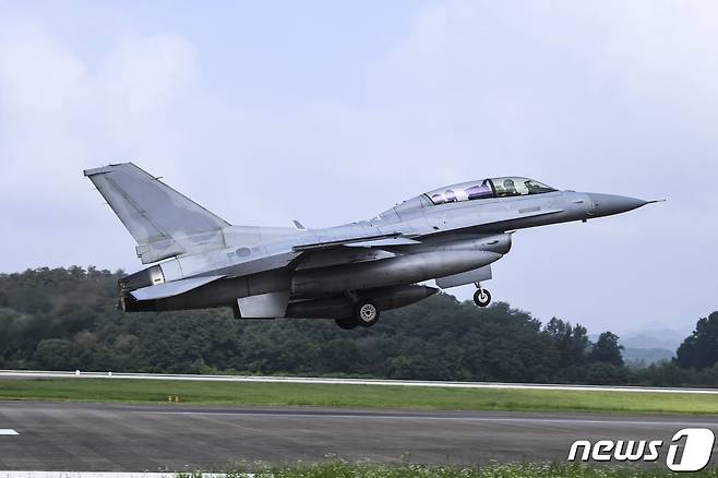 (서울=뉴스1) = 18일 오전 공군 제19전투비행단에서 KF-16 전투기가 대규모 다국적 연합훈련 '피치블랙(Pitch Black)'에 참가하기 위해 이륙하고 있다.