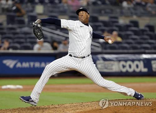 epa10126861 New York Yankees relief pitcher Aroldis Chapman releases a pitch to the Tampa Bay Rays in the tenth inning of the Major League Baseball (MLB) game between the Tampa Bay Rays and New York Yankees at Yankee Stadium in the Bronx, New York, USA, 17 August 2022. EPA/JASON SZENES