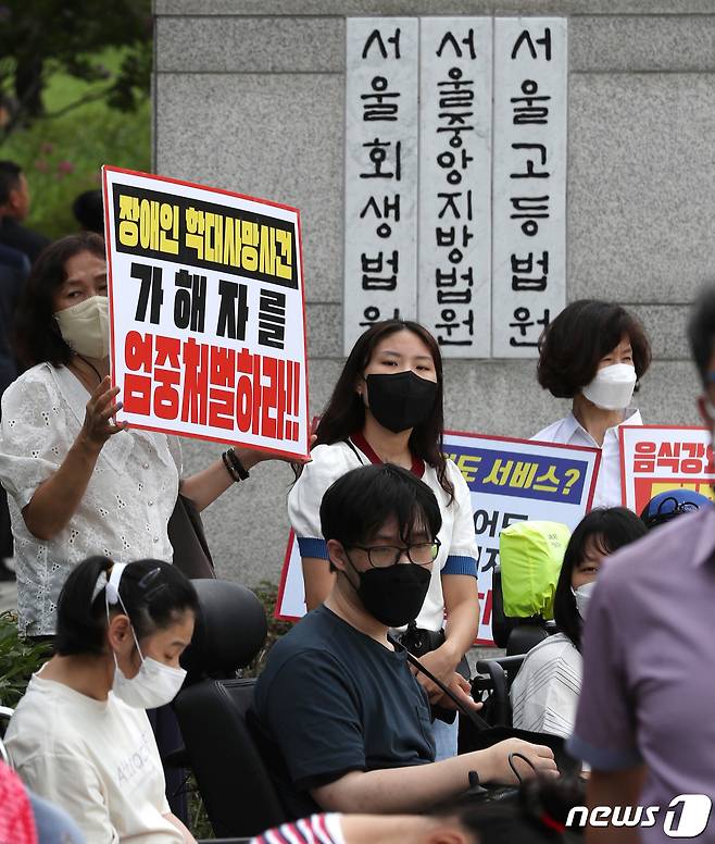 인천 장애인차별철폐연대 회원들이 18일 오후 서울 서초구 서울고등법원 앞에서 열린 인천 음식학대 장애인 사망 1주기 추모 기자회견에서 학대 가해자에 대한 엄벌을 촉구하고 있다.