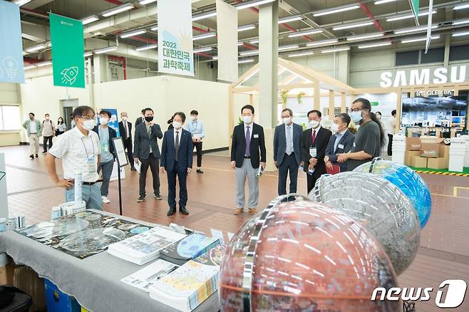 (서울=뉴스1) = 황판식 과학기술정보통신부 미래인재정책국장이 18일 오전 서울 성수동 에스팩토리에서 개막한 '2022 대한민국 과학축제'를 찾아 조율래 한국과학창의재단 이사장 등과 전시장을 관람하고 있다. (과학기술정보통신부 제공) 2022.8.18/뉴스1