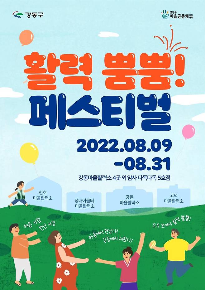 서울 강동구가 8월 한 달 동안 공동체 사업에 대한 주민의 관심과 이해도를 높이고 이웃 간 네트워크를 강화하는 '마을 활력 뿜뿜 페스티벌'을 개최한다.