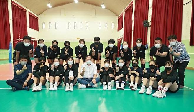 이날 서 교육감은 근영중 배구부 선수들이 훈련 중인 시간에 맞춰 방문해 선수 한명 한명을 격려하면서 힘을 실어줬다.