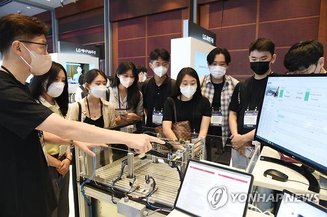 (서울=연합뉴스) 18일 서울 강남구 코엑스에서 열린 '2022 인공지능대학원 심포지엄'에서 LG전자 부스 담당자가 스마트 팩토리를 위한 AI 솔루션 기술을 시연하고 있다. 2022.8.18 [LG 제공. 재판매 및 DB 금지]