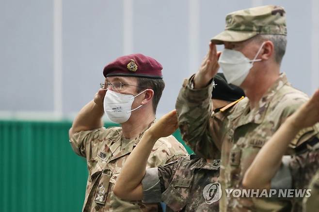 (서울=연합뉴스) 18일 경기도 파주시 캠프 보니파스에서 열린 '판문점 8.18 도끼만행사건 희생자 46주기 추모식'에서 해리슨 유엔사령부 부사령관이 국기에 경례하고 있다. 2022.8.18 [국방일보 제공. 재판매 및 DB 금지]