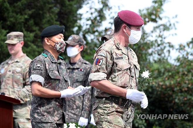 (서울=연합뉴스) 18일 경기도 파주시 캠프 보니파스에서 열린 '판문점 8.18 도끼만행사건 희생자 46주기 추모식'에 참석한 이두희 육군1군단장과 해리슨 유엔사령부 부사령관이 사건이 발생한 장소에 세워진 추모비에 헌화하고 있다. 2022.8.18 [국방일보 제공. 재판매 및 DB 금지]