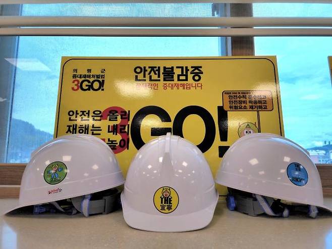 이번 중대재해예방홍보물은 안전모에 부착할 스티커 3종으로 정면에는 의령군을 좌측에는 고고맨 캐릭터 안전장비 3종을 우측에는 근로자가 지켜야할 3GO! 문구를 형상화 했다.