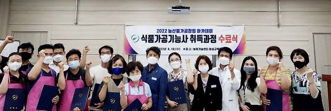 의령군(군수 오태완)은 농업인을 대상으로 실시하는 2022년 농산물가공창업 아카데미를 통해 진행한 ‘식품가공기능사 자격 취득과정 교육’ 수료식을 지난 10일 농업기술센터 여성교육장에서 18명의 교육생이 과정을 수료했다.