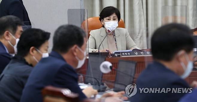 (서울=연합뉴스) 이정훈 기자 = 18일 오후 국회에서 열린 정치개혁특별위원회 전체회의에서 남인순 위원장이 회의를 주재하고 있다. 2022.8.18 [국회사진기자단]