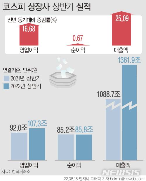 [서울=뉴시스] 최현호 류병화 기자 = 올해 상반기(1~6월) 유가증권시장 상장사들의 매출액과 영업이익, 순이익이 모두 증가한 것으로 나타났다.