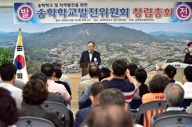 [제천=뉴시스] 이병찬 기자 = 송학중 폐교 저지에 나선 충북 제천시 송학면 주민들과 총동문회가 18일 송학면사무소에서 '송학학교발전위원회' 창립총회를 하고 있다.(사진=위원회 제공). 2022.08.18. photo@newsis.com