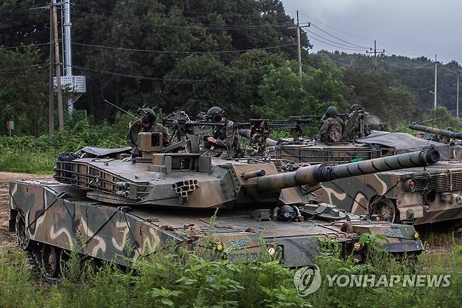 (파주=연합뉴스) 임병식 기자 = 한미 연합연습 '을지 자유의 방패'(UFS·을지프리덤실드)의 사전 연습이 진행 중인 18일 경기도 파주시 접경지역에서 K1 전차가 훈련을 위해 대기하고 있다. 2022.8.18