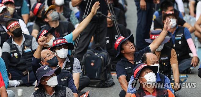 (서울=연합뉴스) 서대연 기자 = 18일 공공운수노조 조합원들이 서울 강남구 하이트진로 본사 앞에서 열린 화물연대 고공농성투쟁 승리 결의대회에서 농성자들을 보며 격려하고 있다. 2022.8.18