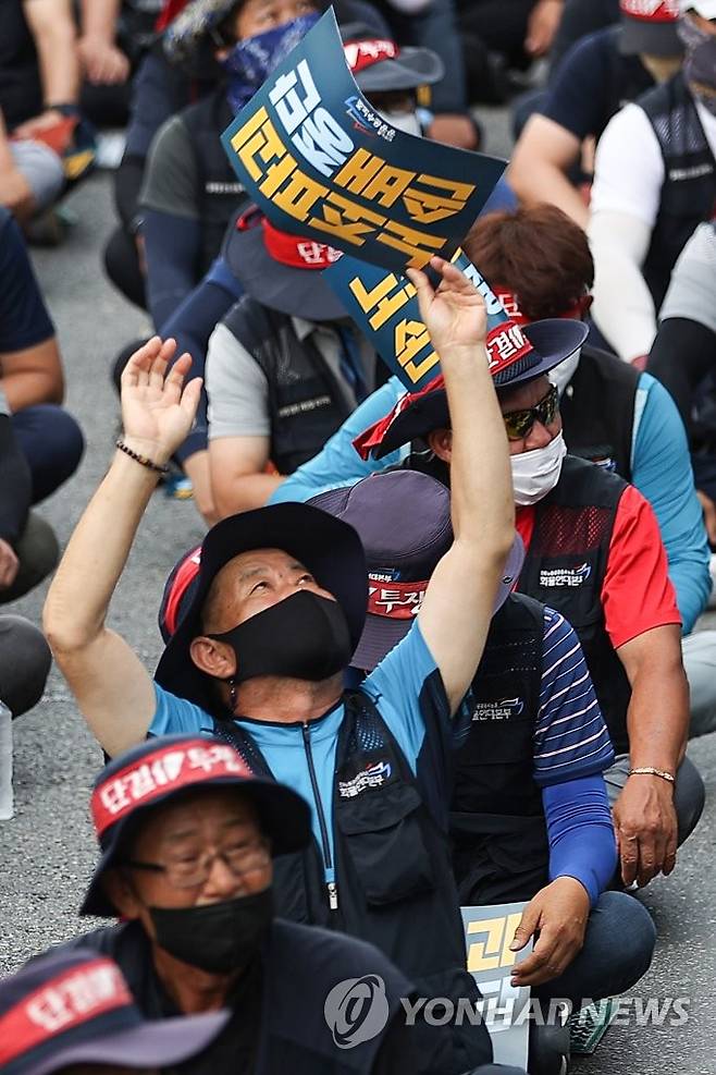 (서울=연합뉴스) 서대연 기자 = 18일 공공운수노조 조합원들이 서울 강남구 하이트진로 본사 앞에서 열린 화물연대 고공농성투쟁 승리 결의대회에서 농성자들을 보며 격려하고 있다. 2022.8.18