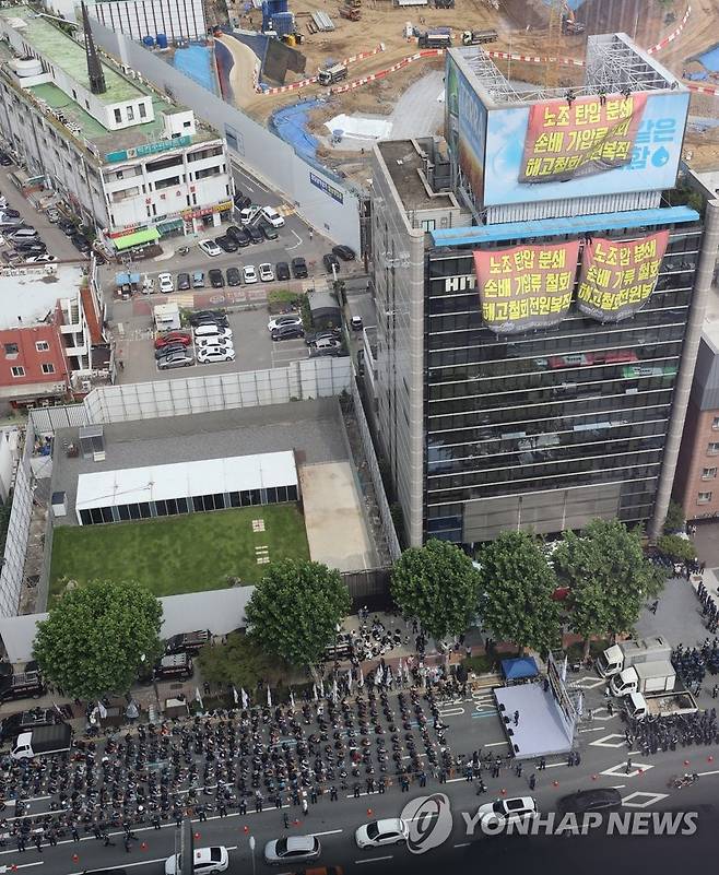 (서울=연합뉴스) 서대연 기자 = 18일 공공운수노조 조합원들이 서울 강남구 하이트진로 본사 앞에서 화물연대 고공농성투쟁 승리 결의대회를 열고 있다. 2022.8.18