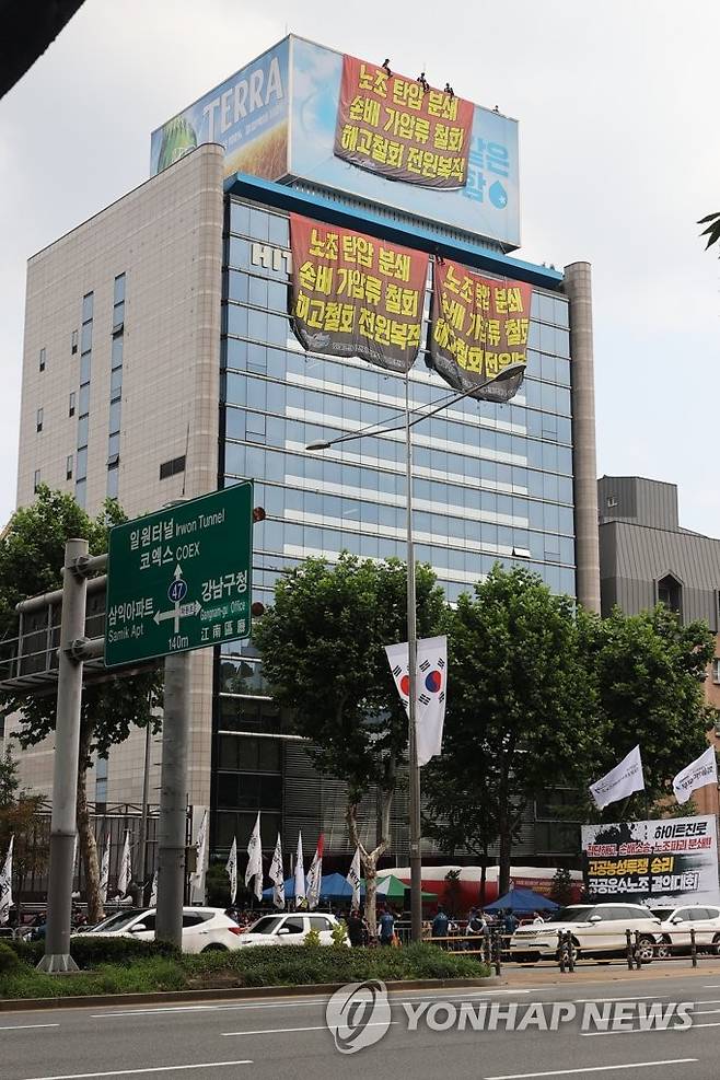 (서울=연합뉴스) 서대연 기자 = 하이트진로에서 고공농성을 펼치고 있는 화물노동자들이 18일 서울 강남구 하이트진로 본사 앞에서 열린 고공농성투쟁 승리 결의대회를 지켜보고 있다. 2022.8.18