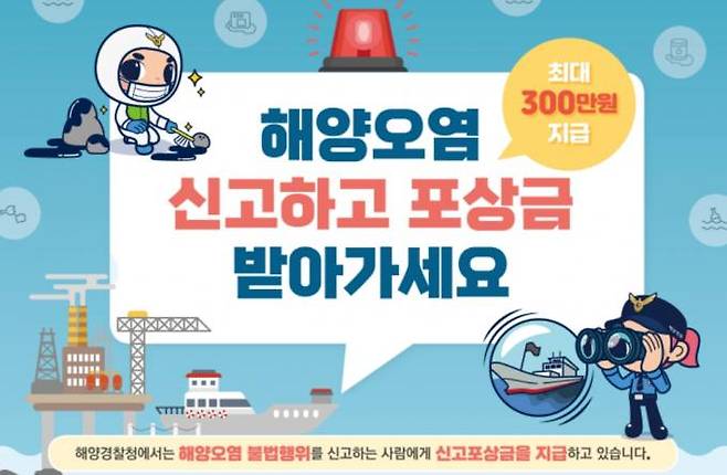 해양오염 신고포상금 제도는 선박 또는 해양시설 등에서 발생한 오염물질을 불법으로 해양에 배출하는 행위를 신고할 경우 해양오염 규모 및 유출물질의 종류에 따라 최소 5만원에서 최대 300만원까지 지급하고 있다.
