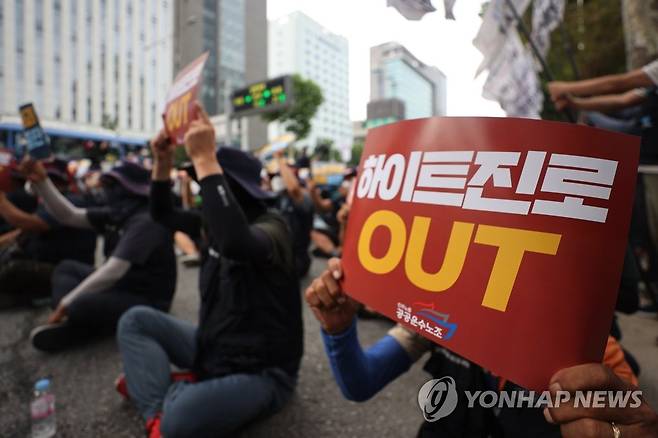 (서울=연합뉴스) 서대연 기자 = 18일 전국민주노동조합총연맹 공공운수사회서비스 노동조합 조합원들이 서울 강남구 하이트진로 본사 앞에서 화물연대 고공농성투쟁 승리 결의대회를 열고 구호를 외치고 있다. 2022.8.18