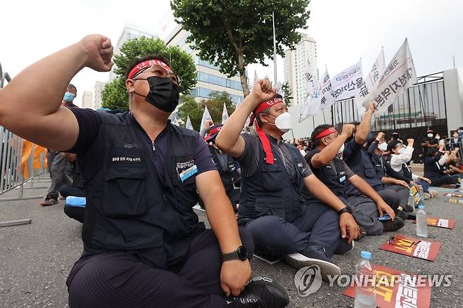 (서울=연합뉴스) 서대연 기자 = 18일 전국민주노동조합총연맹 공공운수사회서비스 노동조합 조합원들이 서울 강남구 하이트진로 본사 앞에서 화물연대 고공농성투쟁 승리 결의대회를 열고 구호를 외치고 있다. 2022.8.18