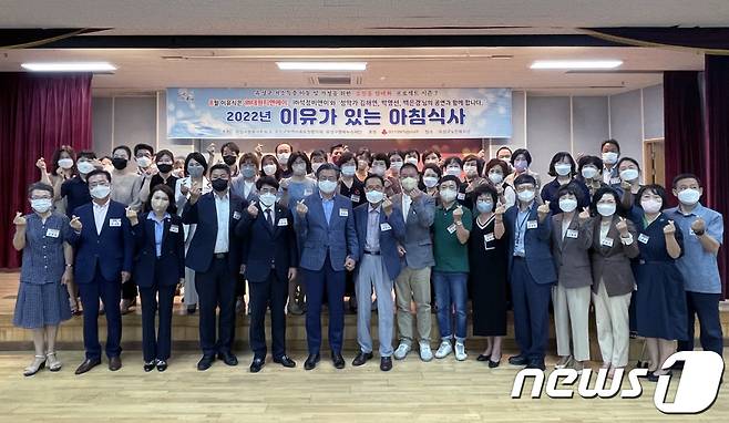 (대전=뉴스1) 김기태 기자 = 정용래 대전 유성구청장이 18일 유성구 노인복지관에서 열린 ‘이유가 있는 아침식사’ 모금행사에서 참석자들과 기념 촬영을 하고 있다. (대전 유성구 제공) 2022.8.18/뉴스1