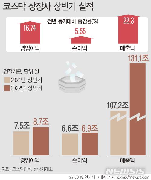 [서울=뉴시스] 최현호 류병화 기자 = 올해 상반기 코스닥 상장사들의 매출액과 영업이익, 순이익이 모두 전년 동기 대비 큰 폭 증가한 것으로 나타났다.