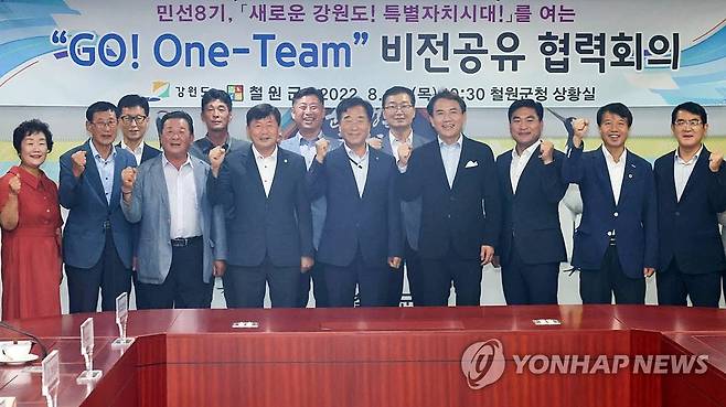 (철원=연합뉴스) 18일 강원 철원군청에서 열린 '강원도-철원군 비전공유 협력회의'에서 김진태 도지사와 이현종 군수 등 참석자들이 기념촬영을 하고 있다.