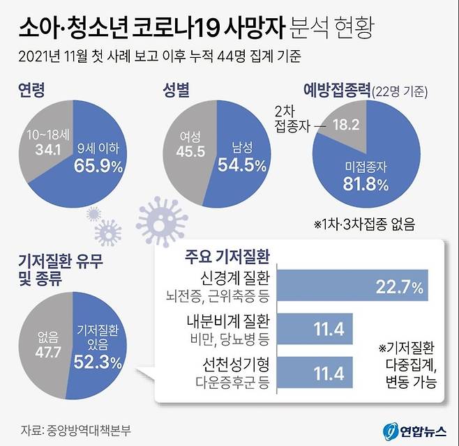 소아·청소년 코로나 사망자 누적 44명.."5세 이상, 기저질환 있으면 접종 권고"
