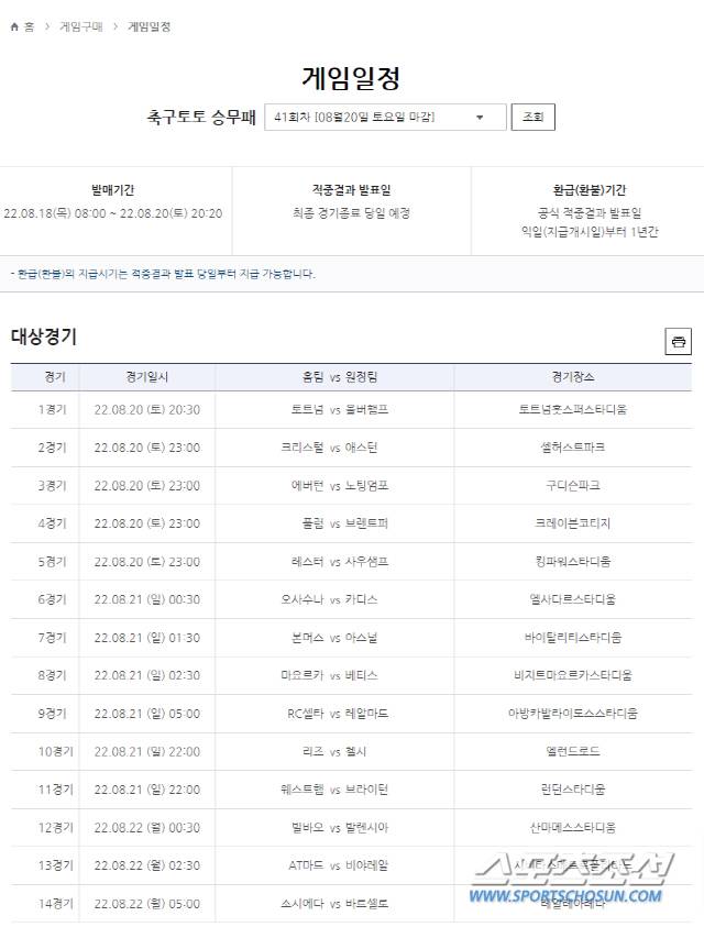 한편, 이번 축구토토 승무패 41회차에 대한 자세한 내용은 스포츠토토 홈페이지 및 공식 온라인 발매 사이트 베트맨에서 확인할 수 있다. 류동혁 기자 sfryu@sportschosun.com