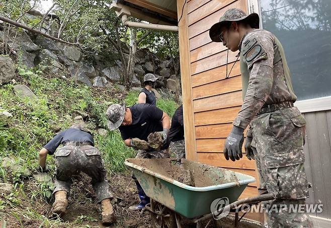 (부여=연합뉴스) 18일 충남 부여군 은산면 거전리 한 주택에서 육군 제32사단 기동대대 장병들이 지난 14일 새벽 폭우로 흘러들어온 나무를 치우고 있다. 2022.8.18 [32사단 제공. 재판매 및 DB 금지]