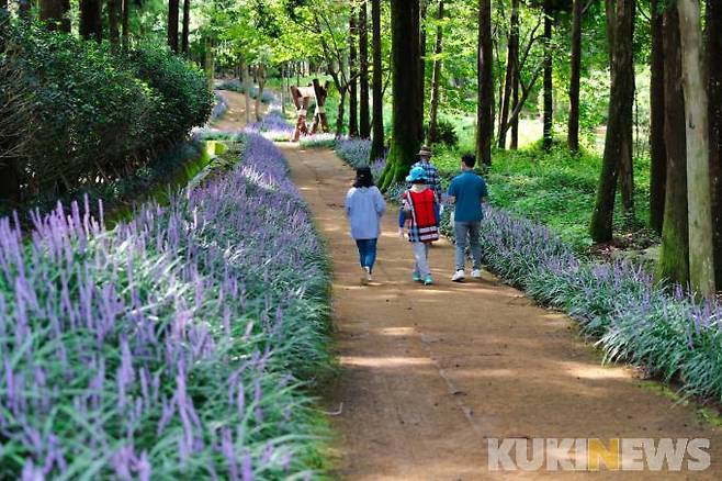 전남 장흥 정남진 편백숲 우드랜드 산책로가 만개한 맥문동 꽃으로 보랏빛으로 물들어 찾는이들에게 색다른 즐거움을 선사하고 있다.[사진=장흥군]