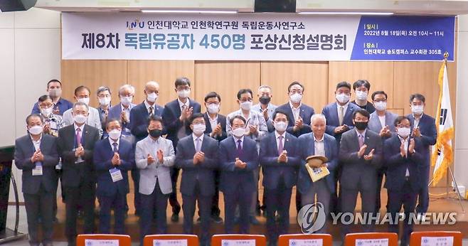 (서울=연합뉴스) 박민식 국가보훈처장(앞줄 오른쪽 네 번째)이 18일 인천대학교에서 열린 제8차 독립유공자 450명 포상신청 설명회에 참석해 주요내빈과 기념 촬영하고 있다. 2022.8.18 [국가보훈처 제공. 재판매 및 DB 금지]