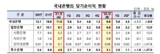18일 금융감독원의 ‘2022년 상반기 국내 은행 영업실적(잠정)’ 자료에 따르면, 올해 상반기 국내 은행은 9조9000억 원의 당기순이익을 올렸다.