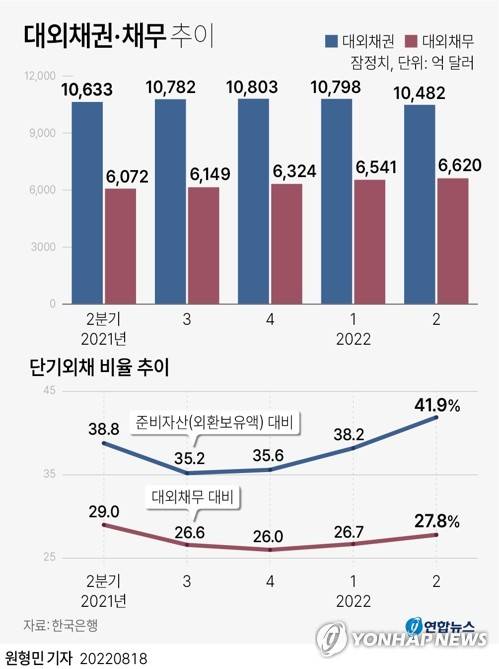 (서울=연합뉴스) 원형민 기자 = 한국은행이 18일 발표한 '국제투자대조표'에 따르면 지난 6월 말 기준 우리나라 준비자산(외환보유액) 대비 단기외채의 비율은 41.9%로, 전 분기보다 3.7%포인트(p) 높아졌다.