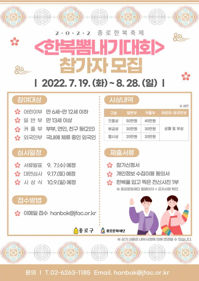 서울 종로구는 '2022년 한복 뽐내기 대회' 참가자를 28일까지 모집한다.