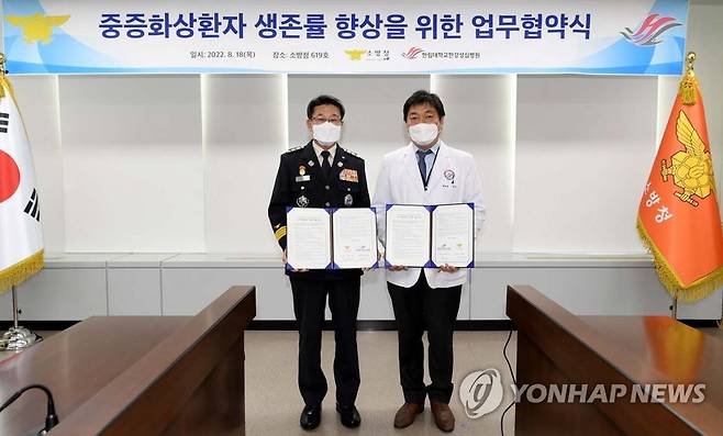 (서울=연합뉴스) 이흥교 소방청장(왼쪽)이 18일 오후 세종시 소방청에서 열린 중증화상환자 생존률 향상을 위한 '소방청-한강성심병원 업무협약식'에서 허준 한림대학교 한강성심병원장과 협약서를 들고 기념 촬영하고 있다. 2022.8.18 [소방청 제공. 재판매 및 DB 금지]
