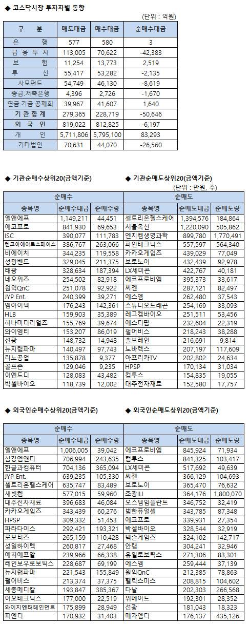 [표]코스닥 기관/외국인 매매동향(8/18 3시30분)