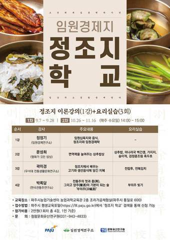 경기 파주시는 오는 9월 7일부터 28일까지 매주 수요일 파주시농업기술센터에서 임원경제지 '정조지 학교'를 운영한다고 18일 밝혔다.