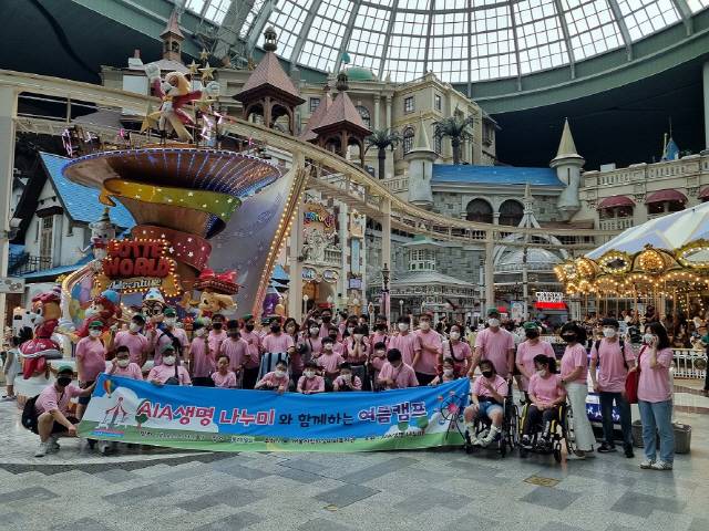 AIA생명은 서울시립뇌성마비복지관 소속 뇌성마비 아이들 16명과 사내 동호회 '나누미 봉사단' 회원 및 그 가족 48명이 참여한 가운데 서울 잠실 롯데월드 어드벤처에서 여름 체험학습을 진행했다고 18일 밝혔다.