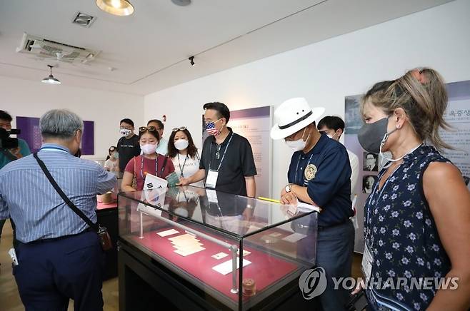 (서울=연합뉴스) '제8차 세계한인정치인포럼'에 참석하고 있는 한인 정치인 70여 명이 18일 오후 서울 서대문구 서대문형무소역사관을 방문해 관계자로부터 설명을 듣고 있다. 2022.8.18 [세계한인정치인포럼 제공. 재판매 및 DB 금지]
