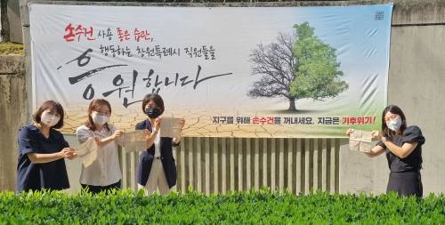 창원특례시(시장 홍남표)는 지난 1월부터 시청, 구청, 읍면동 등 모든 청사의 화장실에서 종이타월 대신 손수건 사용을 선언한 후 8개월째 기후행동을 이어나가고 있는 가운데 불편하지만, 동참하고 있는 직원들을 응원하는 대형현수막 게첨과 그동안의 성과를 공유하는 캠페인을 18일부터 24일(7일간)까지 구내식당 출구에서 실시한다고 밝혔다.
