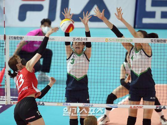 '2022 순천·도드람컵 프로배구대회' 페퍼저축은행과 현대건설의 경기가 18일 오후 전남 순천 팔마체육관에서 열렸다. 페퍼저축은행 박은서가 현대건설 블로킹을 피해 공격하고있다.