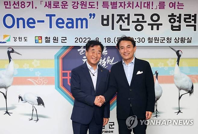 (철원=연합뉴스) 18일 강원 철원군청에서 열린 '강원도-철원군 비전공유 협력회의'에서 이현종 군수(왼쪽)와 김진태 도지사가 기념촬영을 하고 있다.