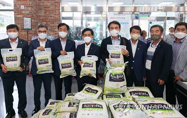 (철원=연합뉴스) 18일 강원 철원군을 초도 방문한 김진태 강원도지사가 김화농협 하나로마트에서 이현종 군수, 김용욱 강원농협 본부장 등과 함께 기념촬영을 하고 있다.